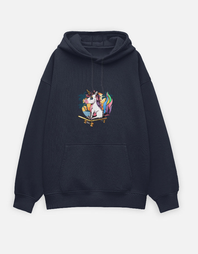 A cheerful unicorn illustration riding a skateboard takes center stage, blending playful fantasy with relaxed street culture. Set on a classic black base, the colorful artwork pops while keeping the overall look balanced and wearable. The design feels lighthearted and expressive—perfect for casual days, creative moods, and effortless everyday styling.