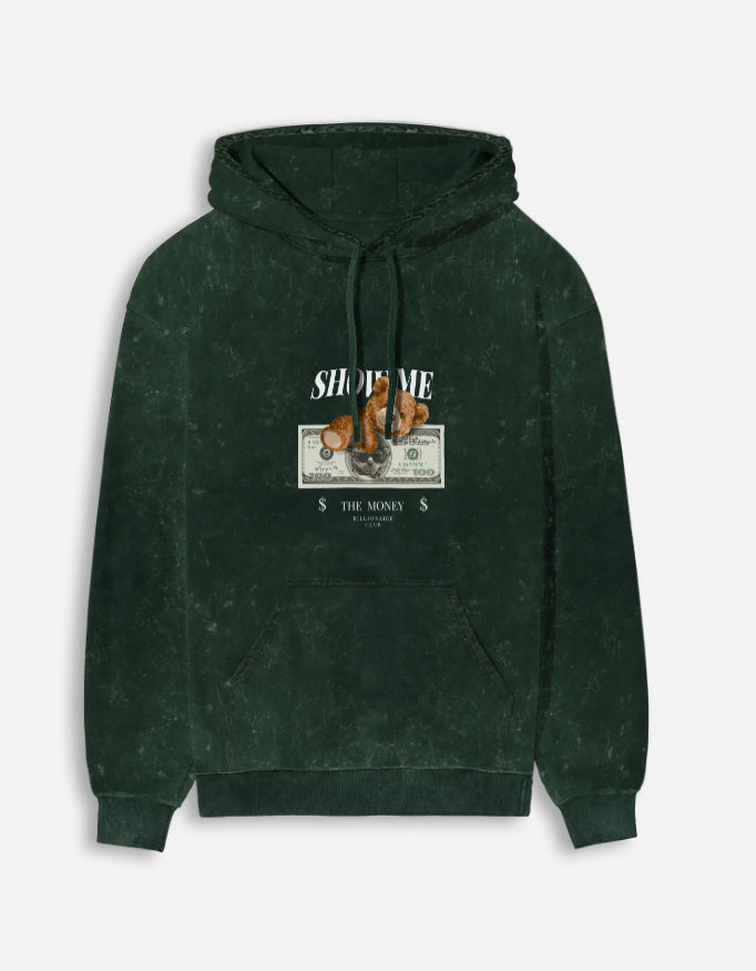 The "Show Me The Money" Unisex Acid Washed Hoodie in black features a distressed wash with a bold front graphic of teddy bears and dollar art, giving it a street-luxe vibe. The washed finish and oversized cut make it perfect for edgy, casual outfits.