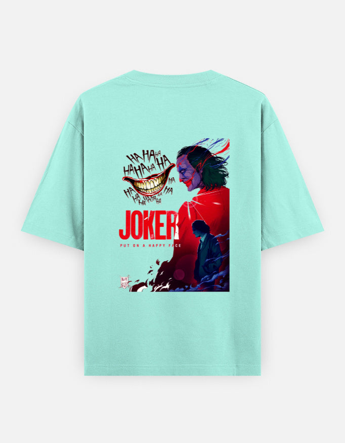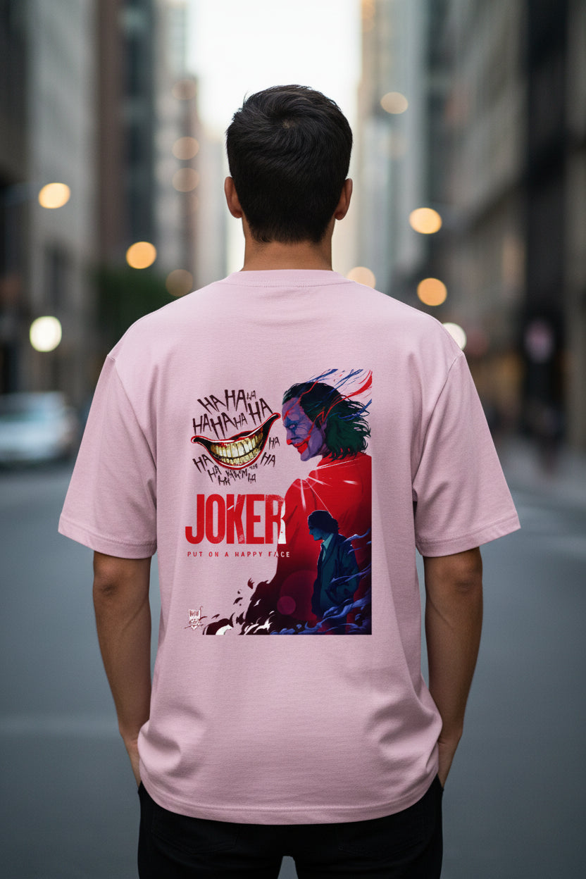 Step into madness with this oversized tee that captures the chaotic brilliance of the Joker. The front features a sinister smile surrounded by “HAHAHA” typography, with JOKER in bold red and the chilling phrase “Put on a happy face” beneath. On the back, a haunting silhouette of the Joker in a red coat emerges from a swirling, shadowy backdrop—evoking mystery, menace, and raw emotion. Crafted for comfort and impact, this tee is perfect for fans of dark aesthetics and iconic villains.