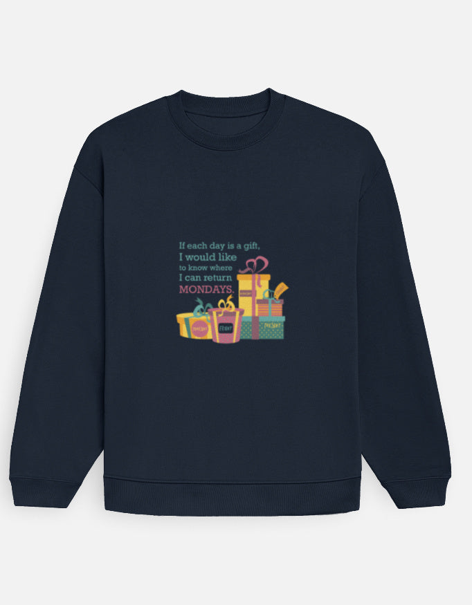 DrapeTales Unisex Oversized Sweatshirt in soft lavender featuring a stack of colorful gift boxes with the cheeky quote: “If each day is a gift, I would like to know where I can return Mondays.” The pastel yellow, pink, and teal illustration sits centered on the chest and pops gently against the light background, giving cozy, sarcastic office-humor vibes. The 90/10 cotton-poly 400 GSM fleece and relaxed oversized fit make it perfect for lazy Mondays, work-from-home days, and anyone whose favorite hobby is not showing up to the start of the week.