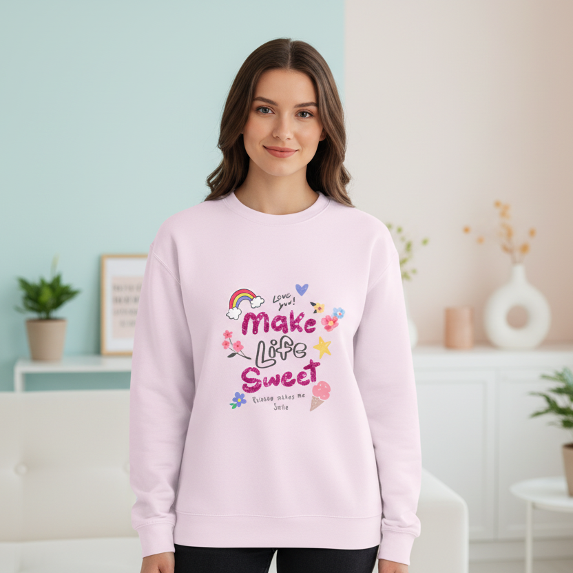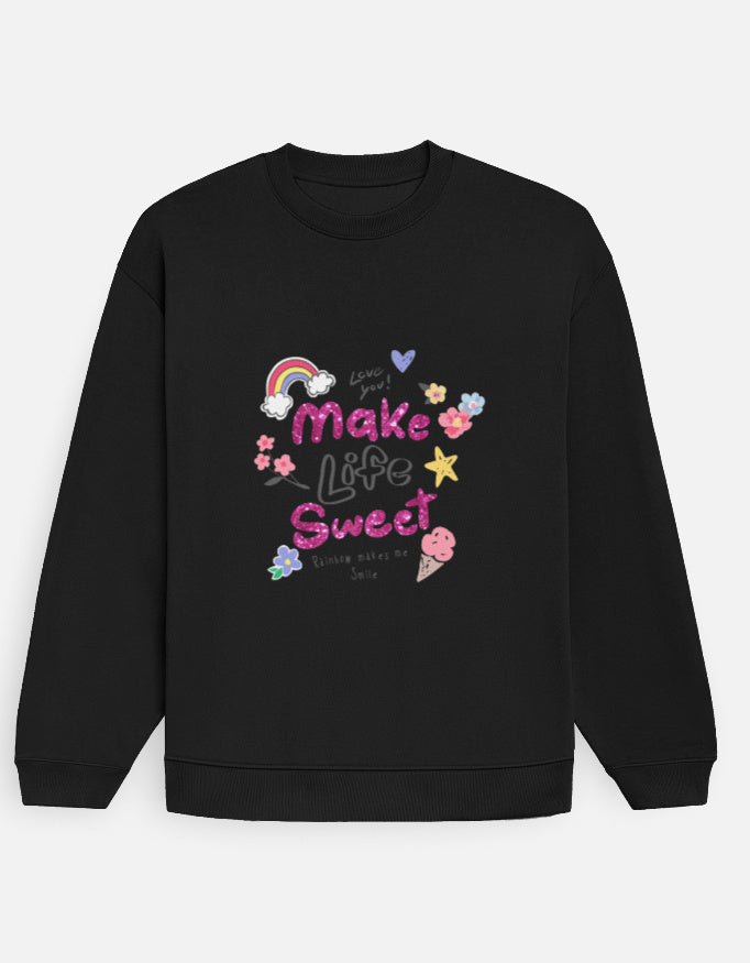 This lilac unisex oversized sweatshirt features a playful “Make Life Sweet” graphic with rainbows, hearts, flowers, stars, and doodle-style treats, creating a cheerful, kawaii-inspired look. The pastel base and bright artwork make it perfect for cozy, feel-good outfits.
