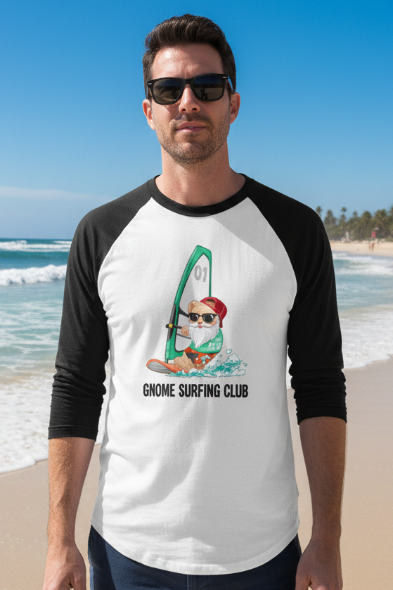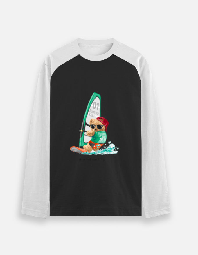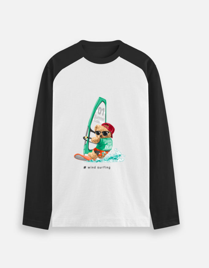 This unisex raglan t‑shirt features a cute sunglasses-wearing bear windsurfing on turquoise waves, giving it a playful summer-sports vibe. The black contrast sleeves frame the bright central graphic, making it stand out for casual, beach, or streetwear looks.